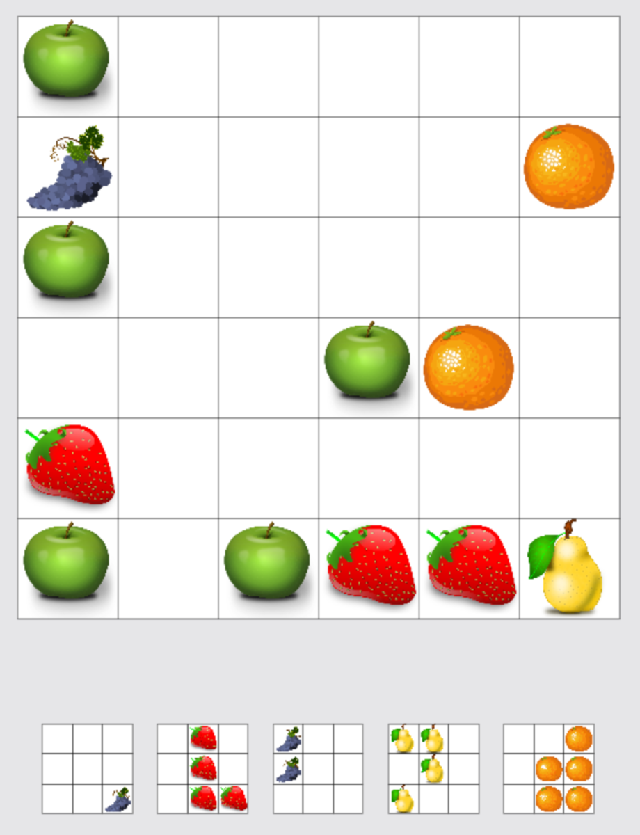 - 手持ちのパネルを 1枚選択しフィールド上のフルーツと重ならないように配置する(パネルの回転は出来ない)