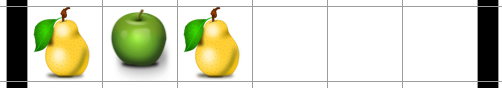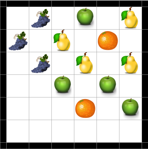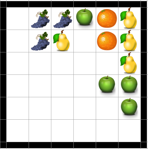 配置後にフィールドをチェックして横か縦にフルーツが 1列並ぶと消えます。ラインを消した場合はスコアが与えられ、その得点は各ライン毎に 消したラインの数 * 消したラインに含まれるフルーツの最頻出値 ** 2 で計算されます。